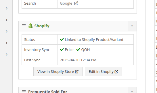 The "In Shopify" checkmark at the top of Item Dashboard has been replaced with a dedicated Shopify section in Item Dashboard. This allows you to view more details, including connection status of the Product, sync status, and the last sync time:
