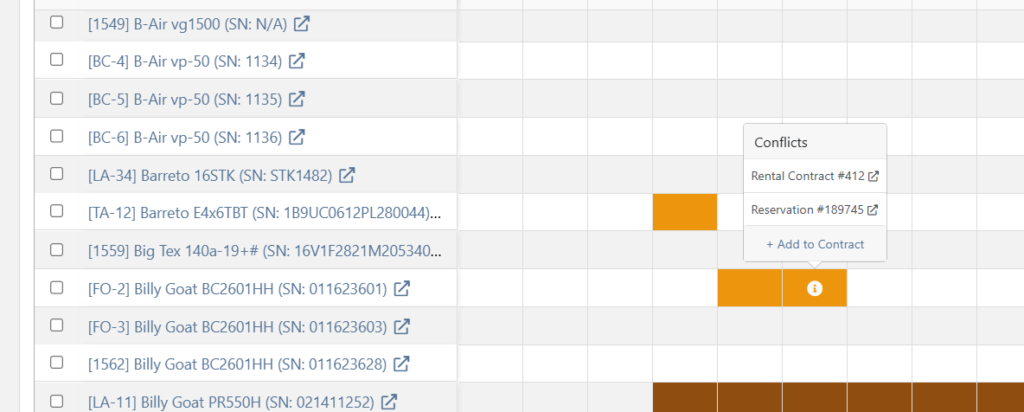Complaint: Rental Clerks noticed that some machines showed days with conflicts (denoted by colored cells), but when they clicked on the cell the pop up would show “No Conflicts”.