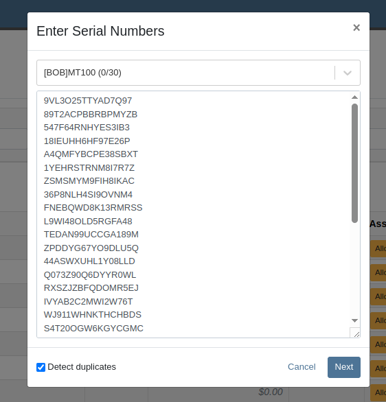 From this dialog, select a Model, then type or paste in the serial numbers. Serial numbers can be separated by line breaks, commas, or a mix of both: