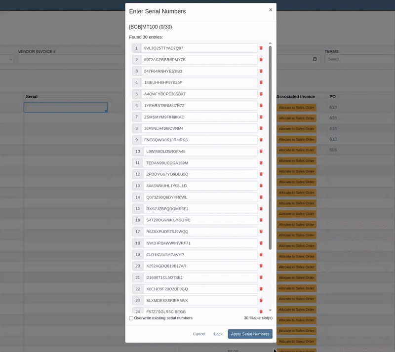To use this feature, click the "Enter Serial Numbers" button near the top of an MPO Voucher: