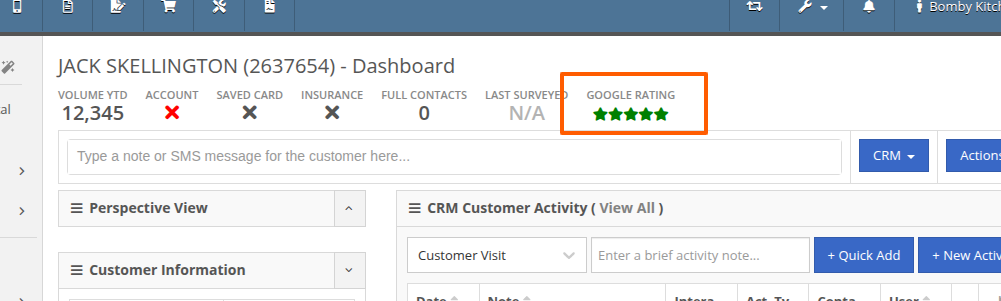 Once a review is linked, that customer's latest Google Review rating will automatically appear at the top of their Customer Dashboard, giving sales teams instant context during interactions.