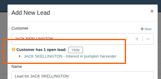 Salespeople noted that after selecting a customer when creating a lead, if an existing lead was found for the customer, the notice was too small and would often be overlooked. This would result in users unintentionally creating duplicate leads for a customer.