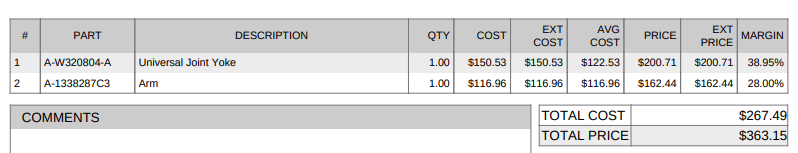 A new “Generate Cost Report” option has been added under Details → Actions on the Sales Order page. This feature produces a PDF showing customer details and a table of line items with part numbers, cost, average cost, sale price, and margin (based on average cost), along with totals at the bottom.