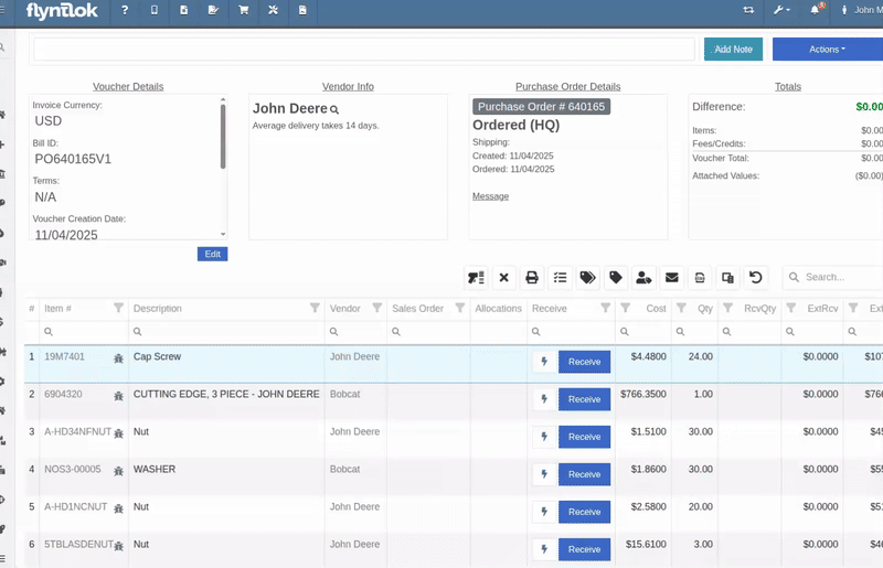 Building on the new Quick Receive enhancement, users also requested a way to process entire vouchers at once. This would be especially useful for large orders where most items are received in full. Manually clicking “Receive” for each line, even with the quick option, could still be time-consuming when handling dozens of parts.