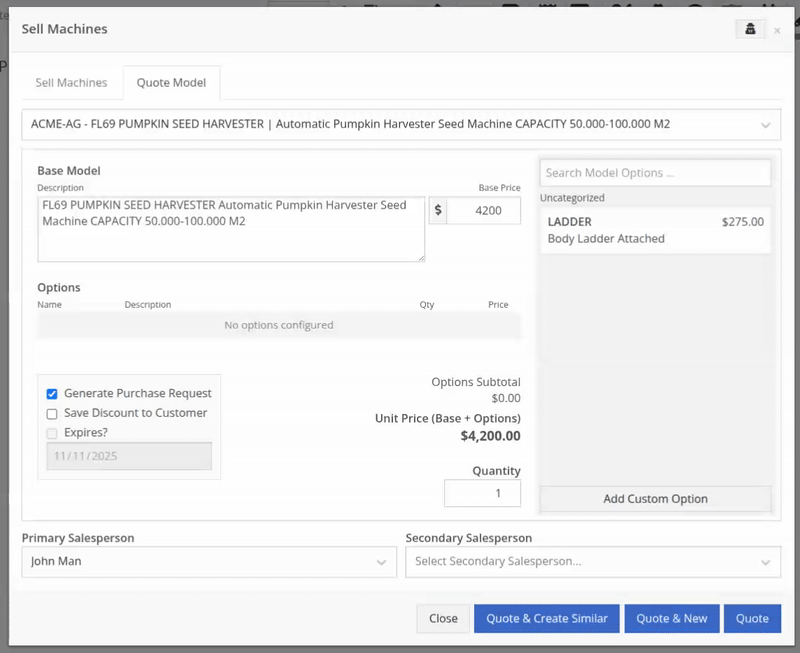 We've added a new "Quote & Create Similar" button to streamline quoting workflows. After creating a model quote, the screen will now stay open, allowing the salesperson to make small adjustments and quickly configure another model. Users quoting higher quantities can simply click the button again to add additional models with ease.