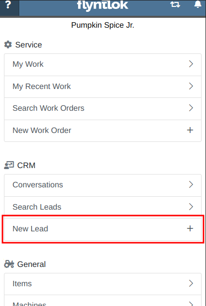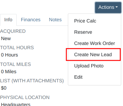 Additionally, users can create new leads directly from the Mobile Machine Dashboard via the Actions dropdown: