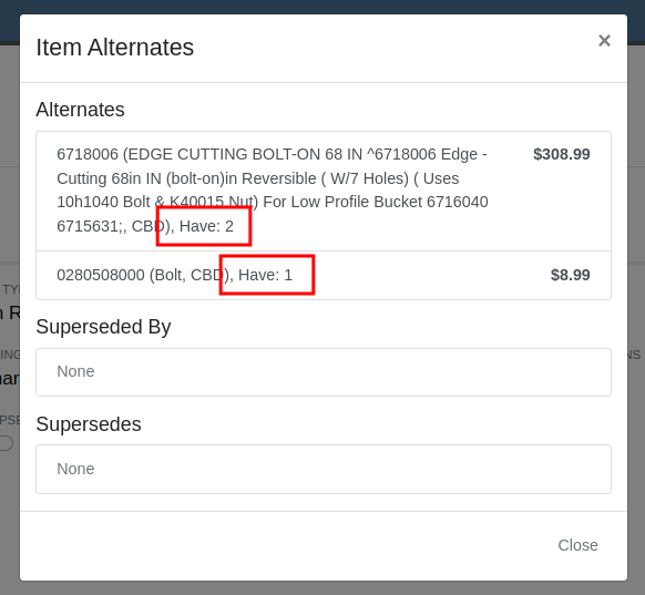 Complaint: Technicians mentioned that when looking up Alternates for Items on Work Order Dashboard, the quantity on hand was not showing.