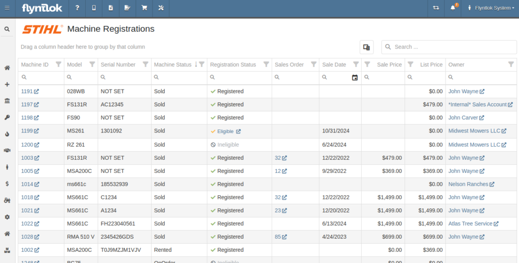 Flyntlok now has a new page for viewing Stihl Machines and their registration status. If a Machine has not been registered and is still eligible for registration, you can open the Register Stihl Machine form from this page to quickly register that Machine.