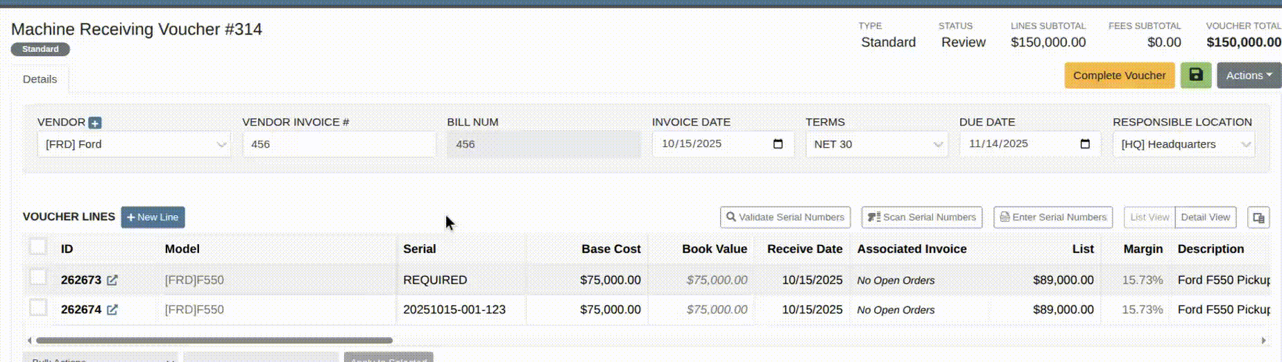 When receiving Machines, there was no way to check applied serial numbers against your machine inventory, or other machines on the same receiving voucher. This made it possible for receivers to apply duplicate serial numbers on machines, which could lead to confusion or issues later on.