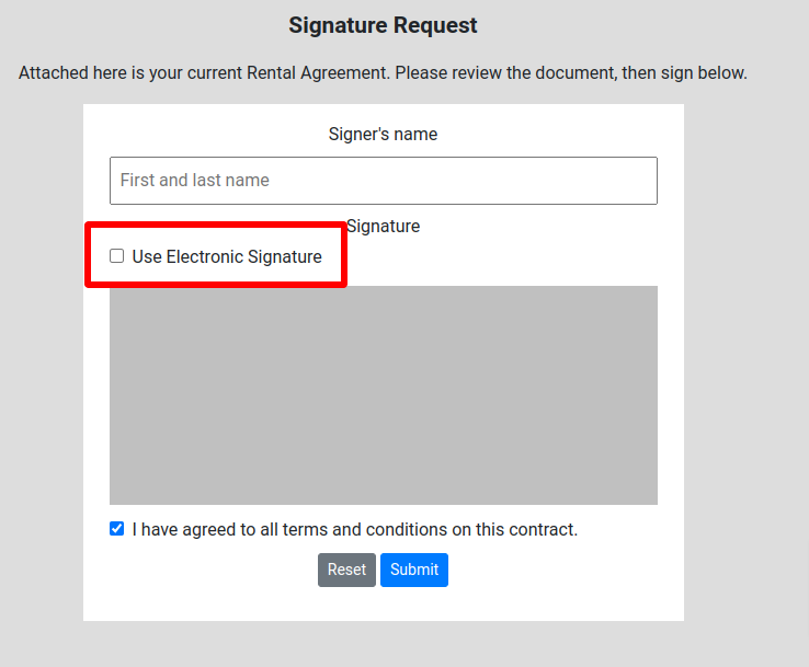 We have added an electronic signature feature to our signature requests. With this feature enabled, there is an additional option to “Use Electronic Signature” on the request.