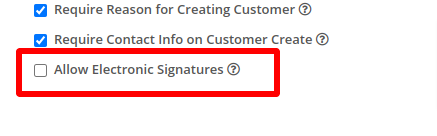 To enable this feature, go to Flyntlok Settings and scroll down to “Allow Electronic Signatures” under the Company section: