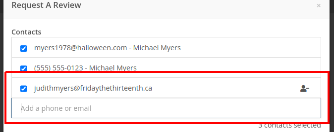 An icon will appear next to newly added phone numbers or email addresses. These will be automatically saved to Customer Contacts after sending the Review Request. On the Lead Dashboard, these will also be saved to the Lead.